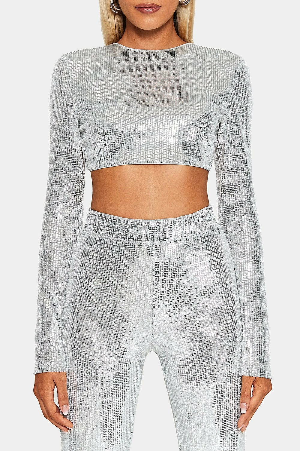 Style:PartyColor:SilverNeckline:Round NeckSleeve Length:Long SleeveHem Shaped:SlimComposition:95% Polyester, 5% Spandex