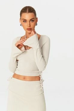 SOLADO Halter Neck Cut Out Drawstring Ruched Long Sleeve Top